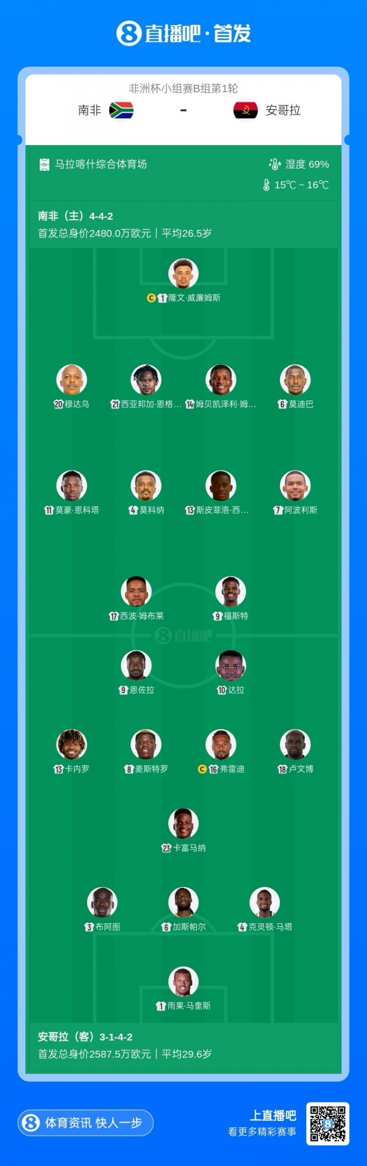 12月23日讯 非洲杯B组首轮,南非vs安哥拉首发出炉。